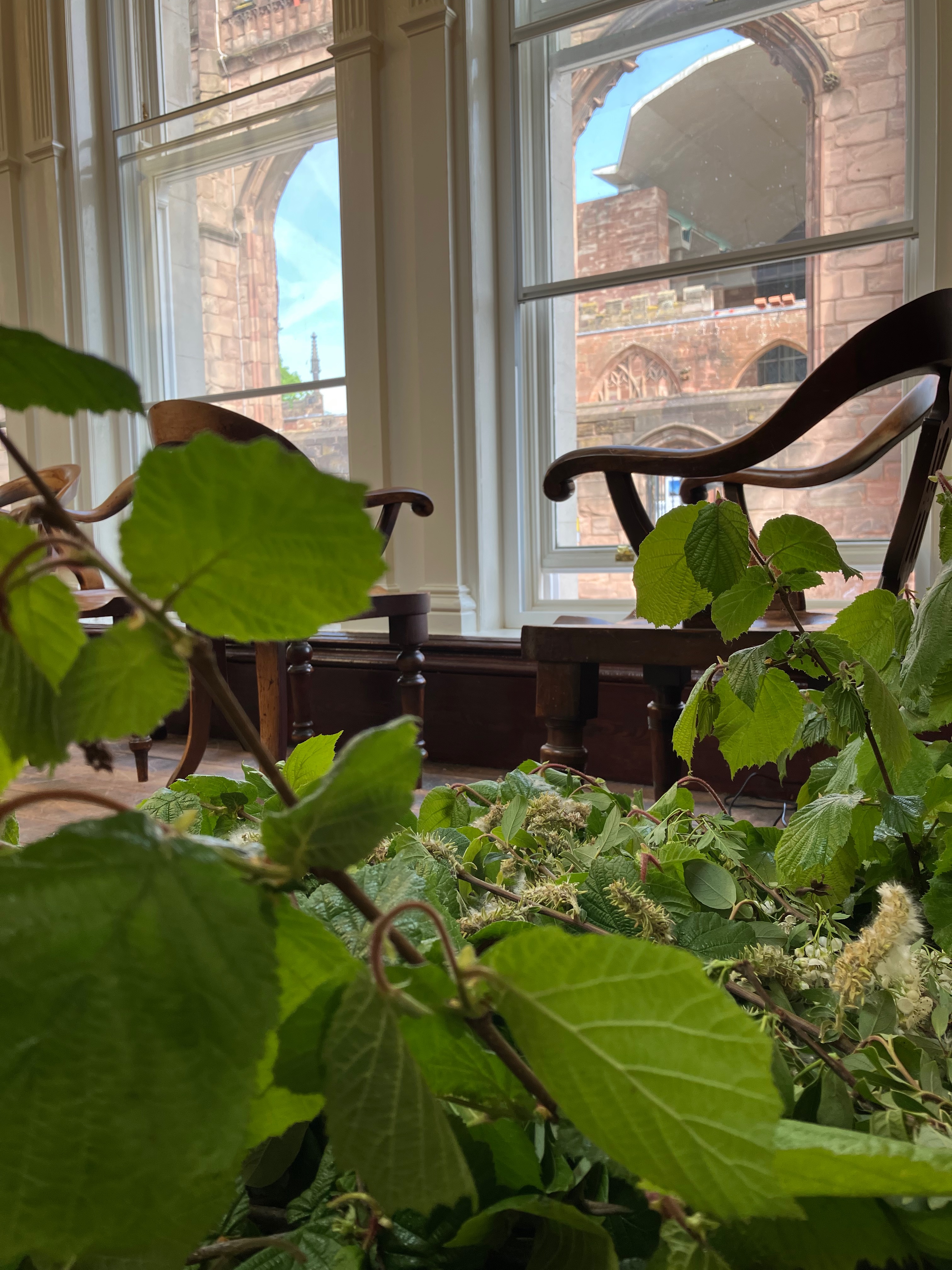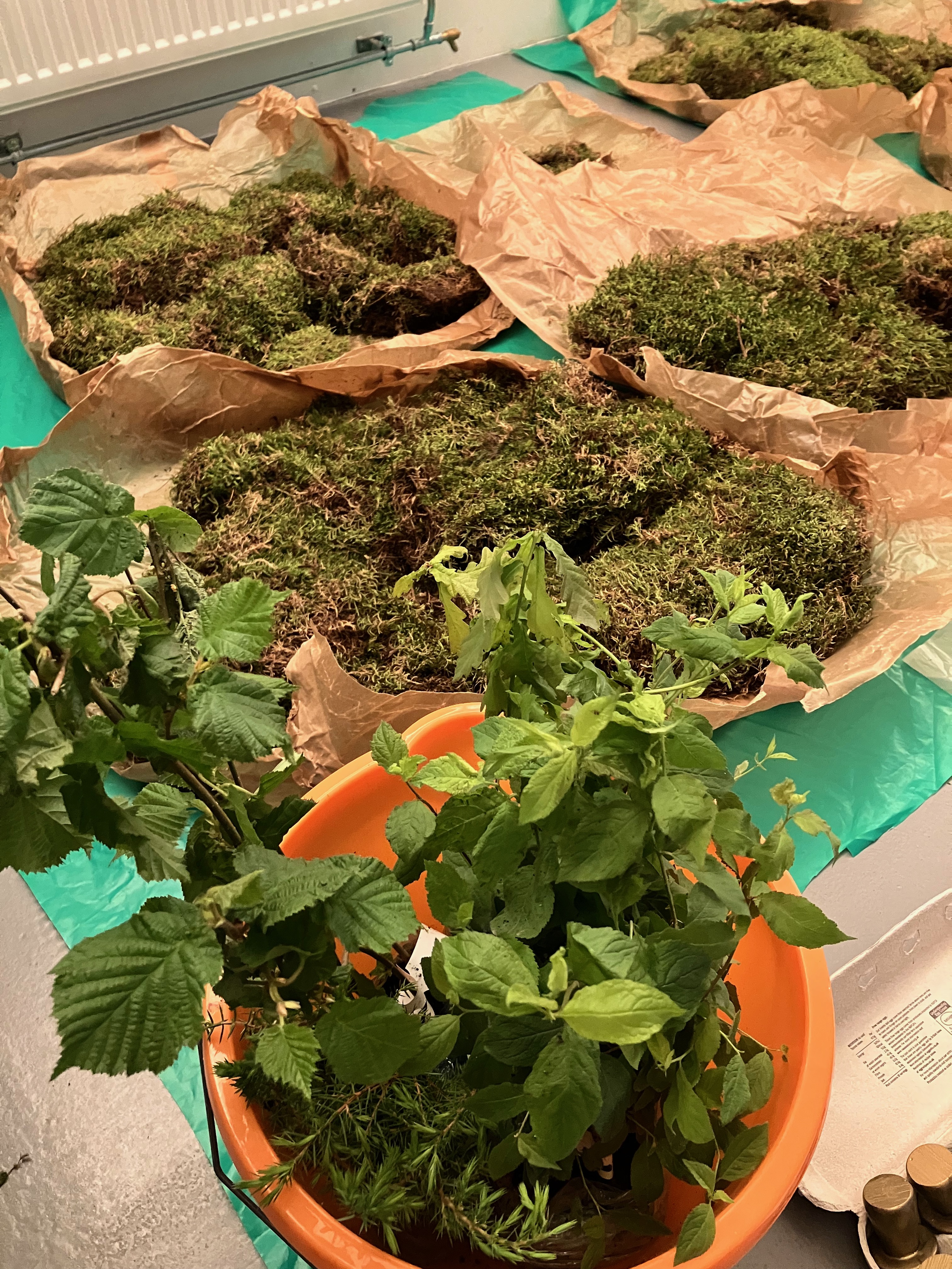 For the meal, I wanted the diners to experience a sense of wonder that, in stepping into the dining room, they had moved into a woodland glade – or that the historic building they were in was gradually and beautifully being reclaimed by nature. Lisa provided mushrooms, and I sourced supposedly sustainable moss (although I still feel guilty about the insects and other creatures that must have been moved on in order for the moss to be collected for me**), bought some tree seedlings from the Woodland Trust to grow in the centre of the table, and collected armfuls of prunings (mostly hazel, ivy and quince) from our gardens and allotments to dress the windowsill, stairs and ledges.