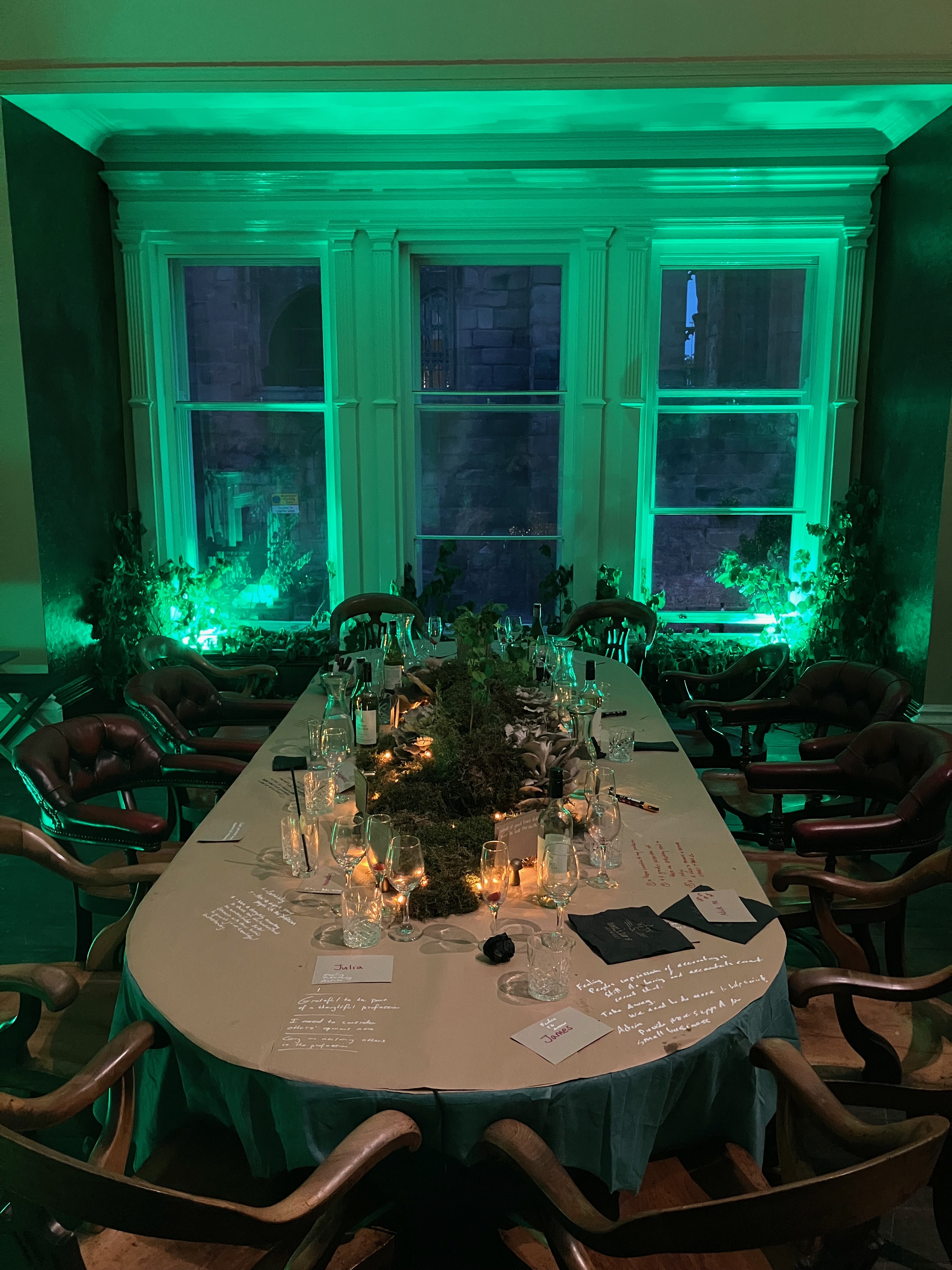 As the evening began, the Master of Cere-monies welcomed the guests and guided them to the bar, where the Clerk to the Chef served them drinks and canapés. They were then directed into the Tearoom. In a pool of light in the centre of the room was the Book-Keeper of the Mushrooms, who guided the guests to collabrate in making mushroom music, told them stories about how fungi communicate, about mycelial systems… Headphones were then handed out, and the guests listened to ‘The Accountant’ audio story. They were guided into the Reading Room, where dinner was served, and the Master of Cere-monies encouraged them to think about, and discuss, the prompt questions on the cards as they ate.