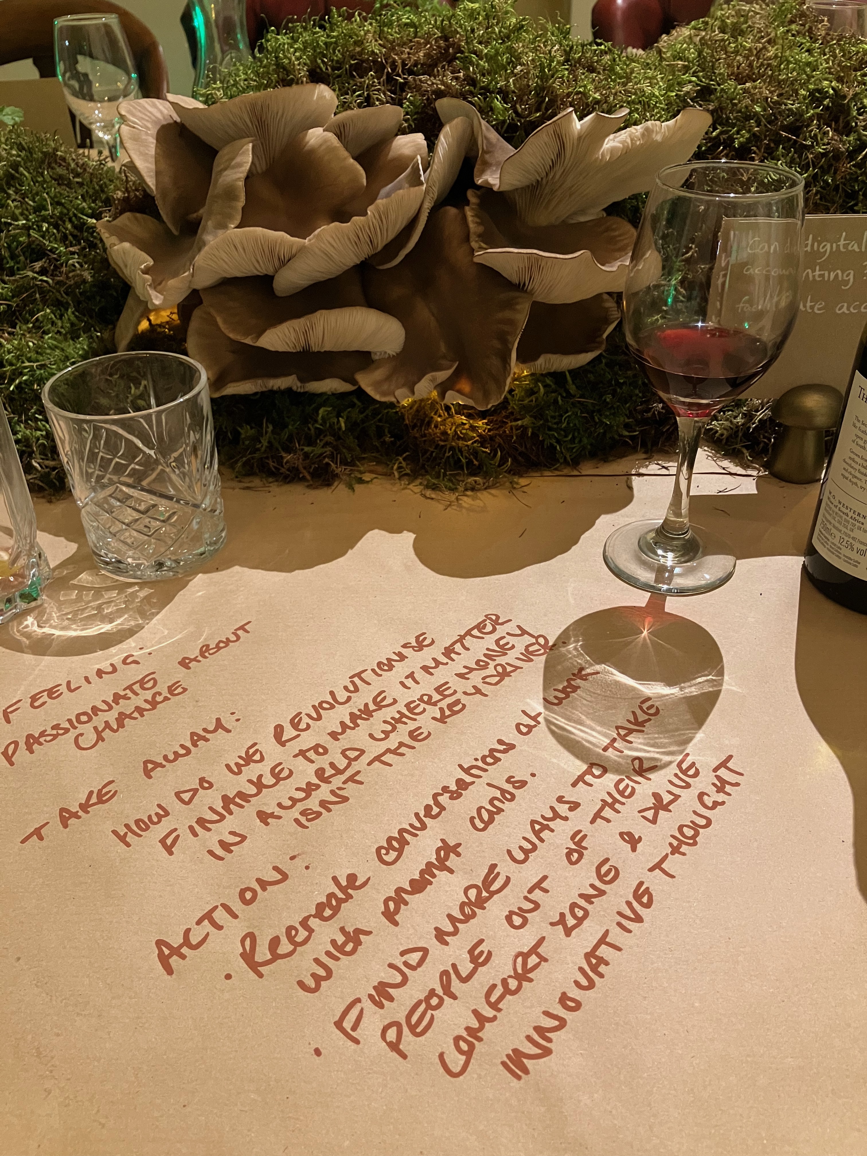 To close, he asked the guests to reflect on the evening and note down one feeling, one takeaway and one action on the paper tablecloth.
