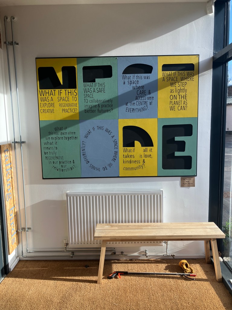 Gayatri’s installation picks up the colours used on the walls in the studios at The Nest, and fills the building entrance with warmth, joy and purpose – even more so when the afternoon sun shines across it!