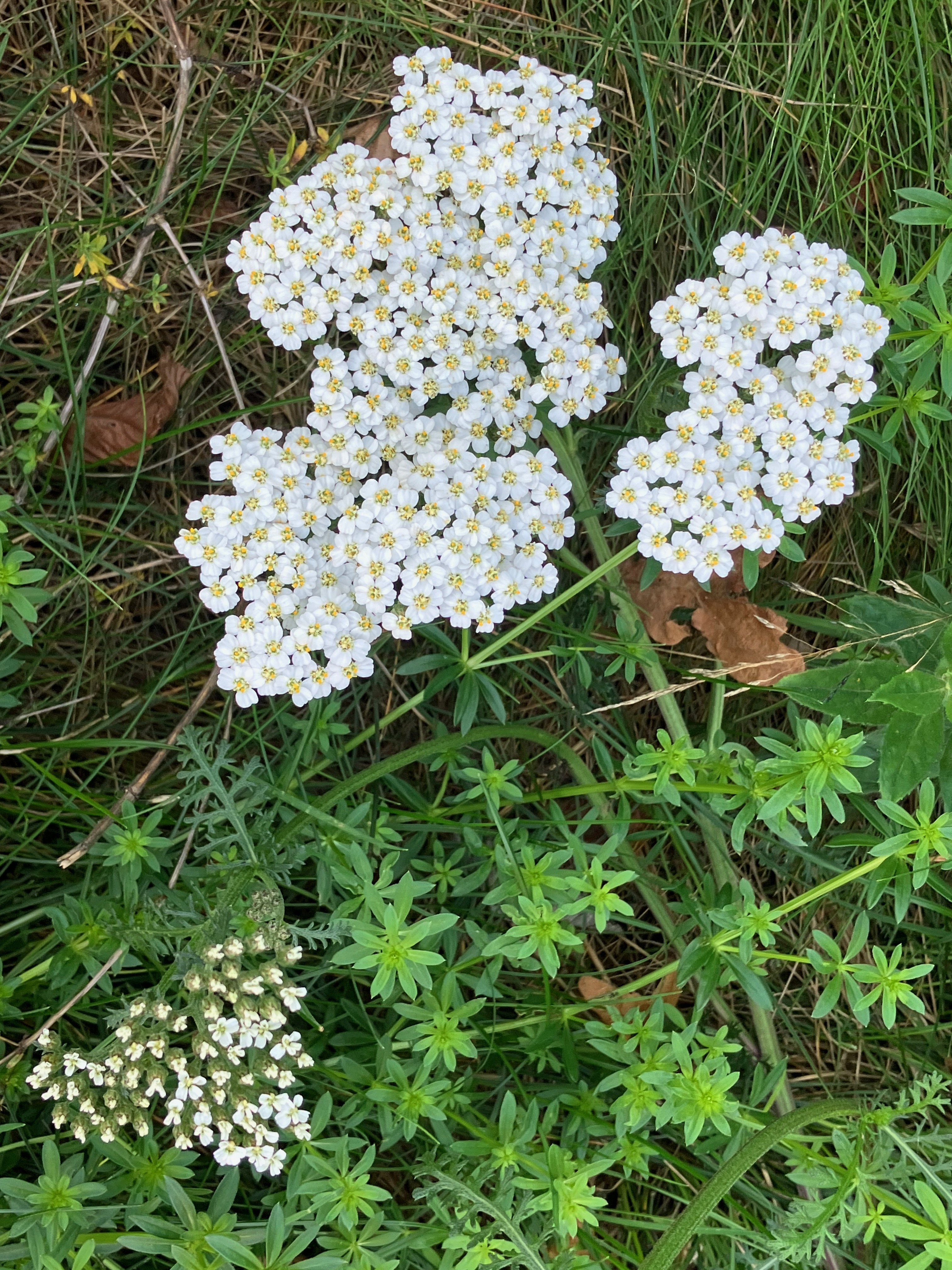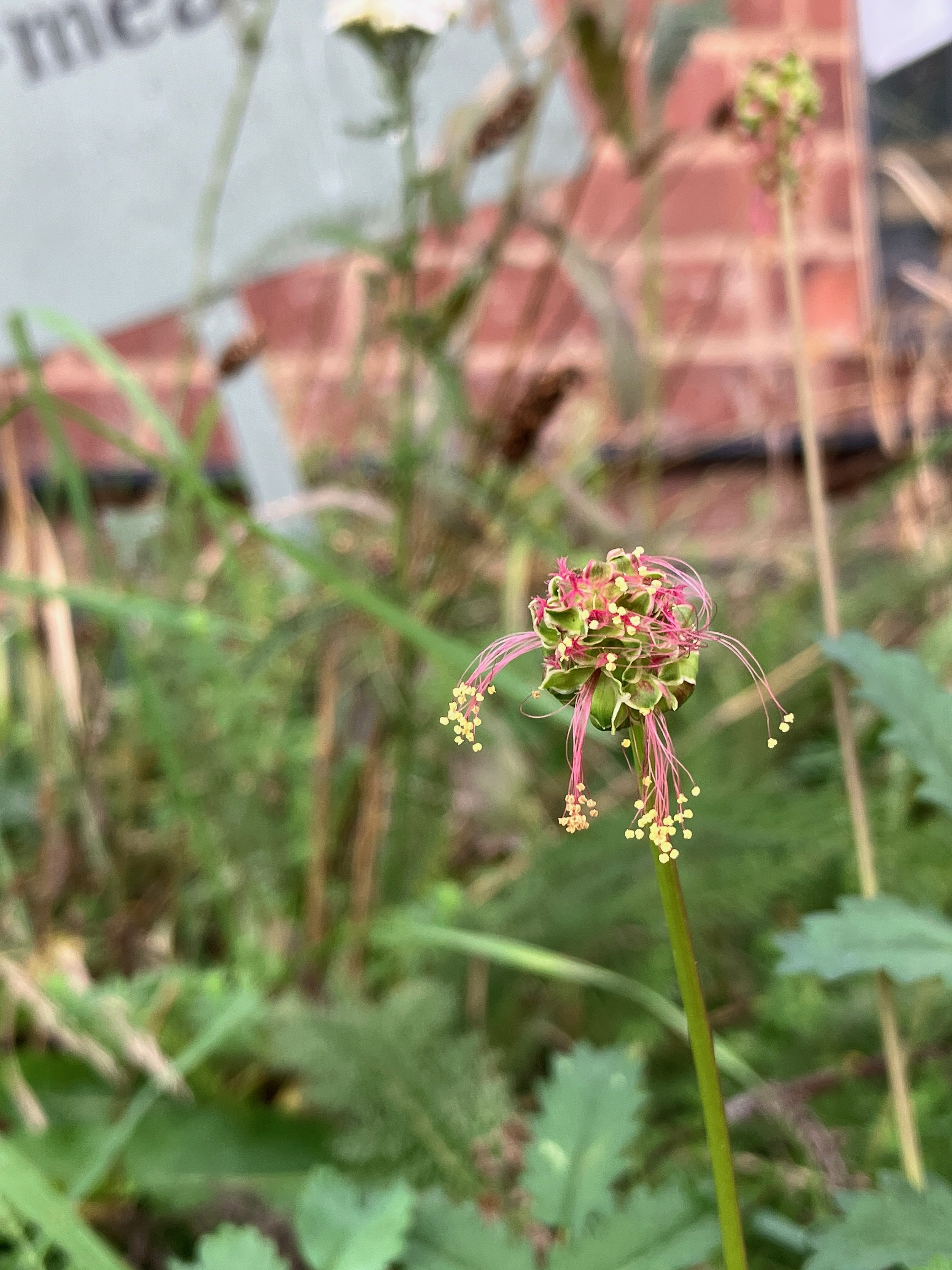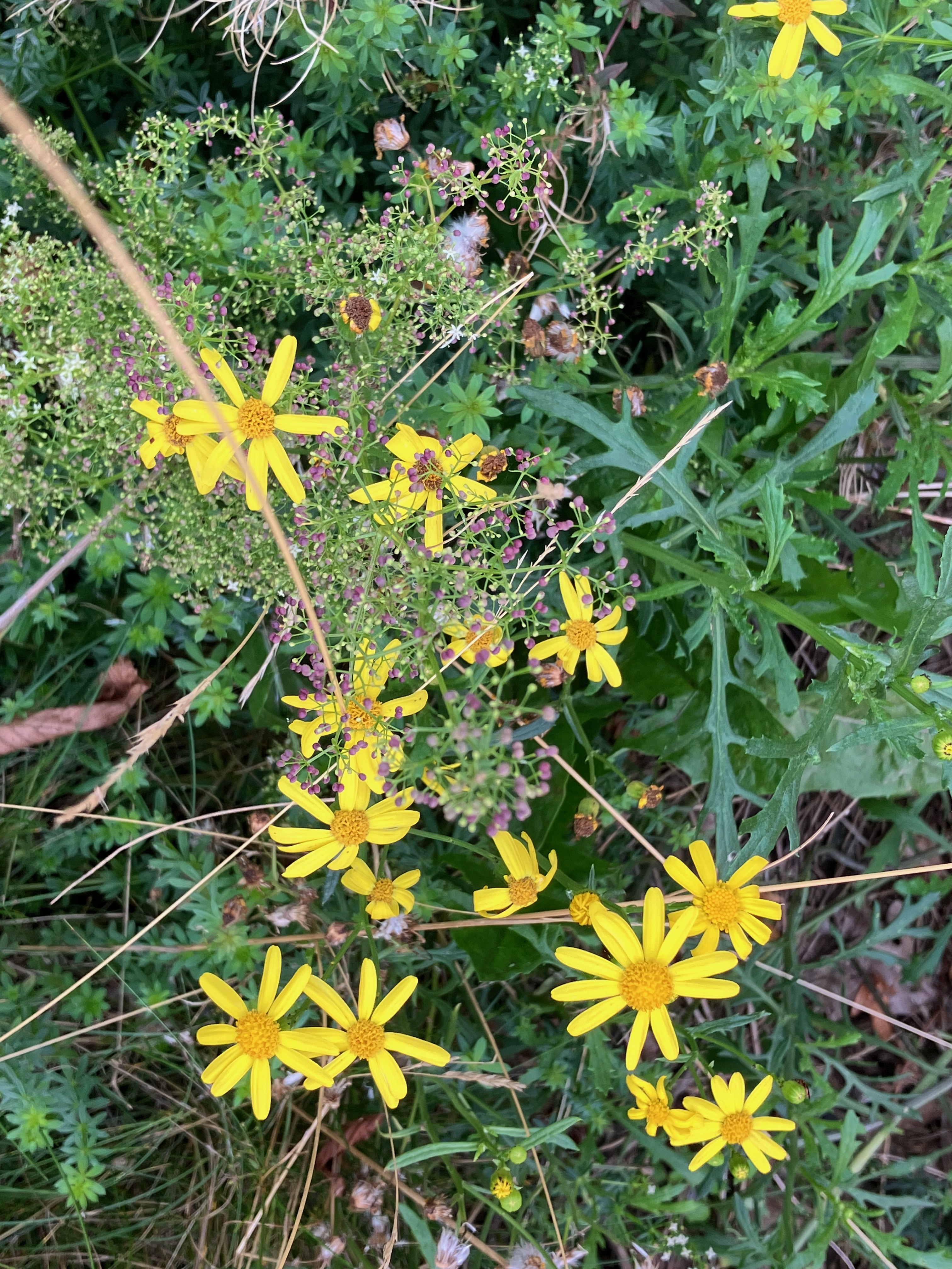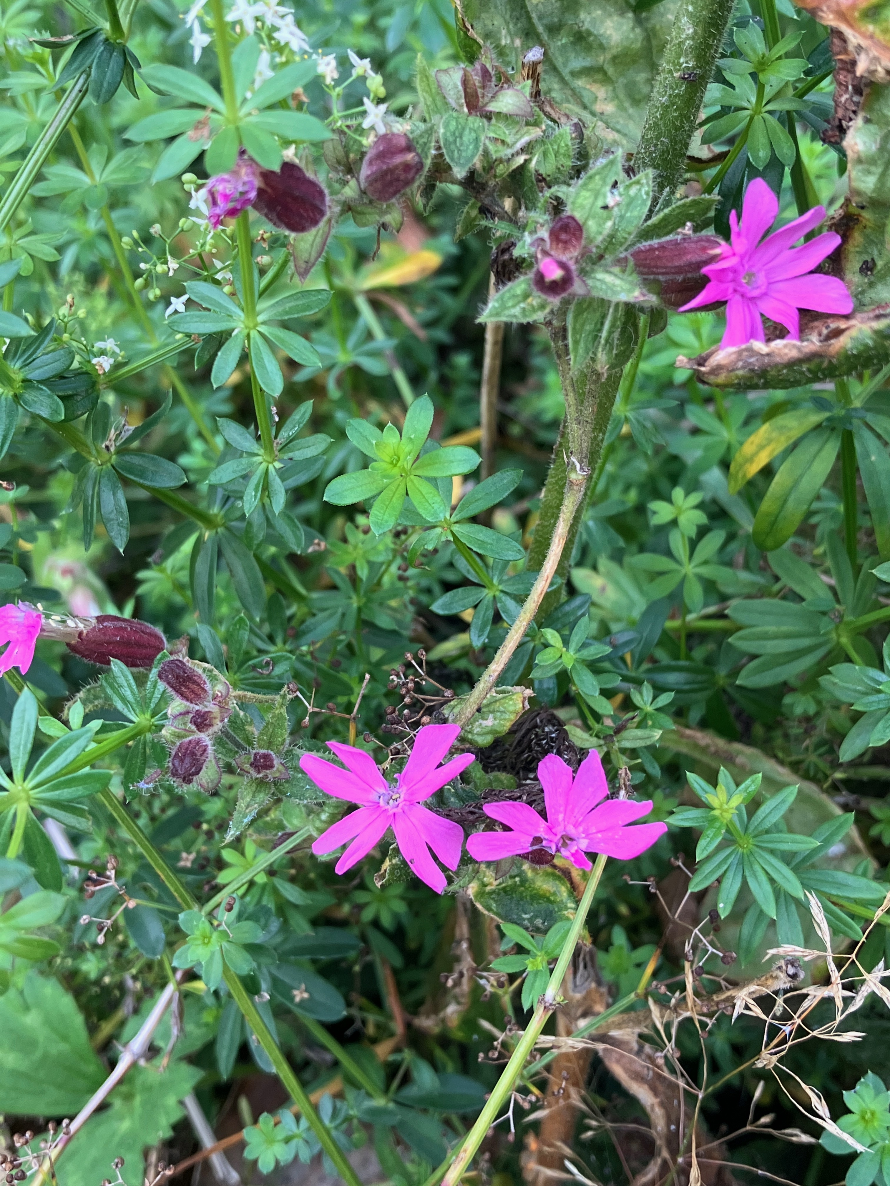 We noted dock seedheads, ragwort, yarrow, hedge bedstraw, red campion, salad burnet, purple toadflax, and common mallow.
